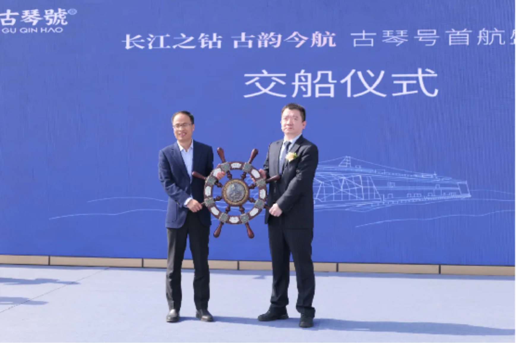 武昌造船黨委書記、董事長(zhǎng)姜濤與武漢文化旅游集團(tuán)副總經(jīng)理周伍華交換船舵,完成了船舶交接,這也標(biāo)志著“古琴號(hào)”正式加入長(zhǎng)江航運(yùn)大家庭。